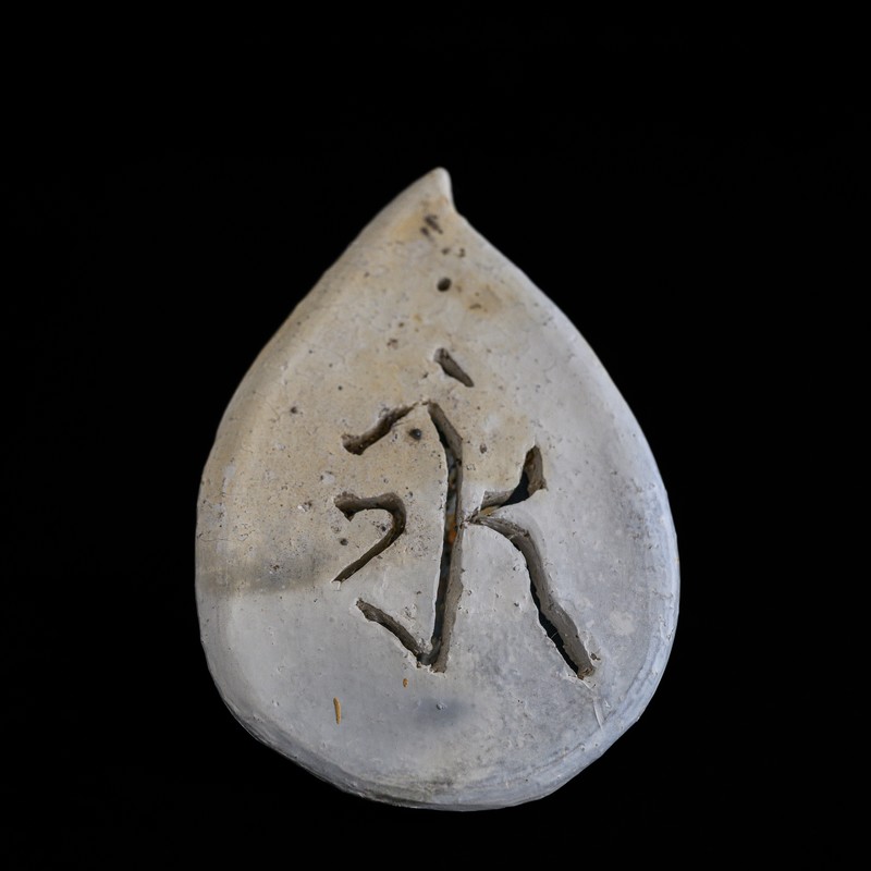 Idéogramme de l’éternité gravé sur une feuille de grès blanc sigillée, polie et enfumée qui peut être suspendu